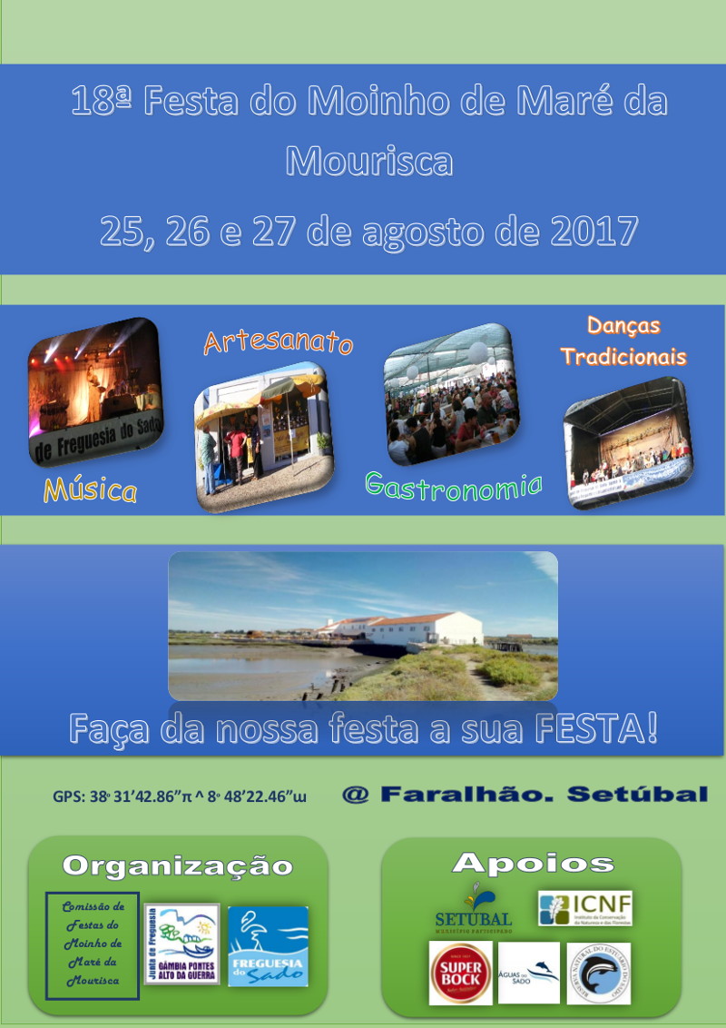 A 18º Festa do Moinho de Maré da Mourisca é uma organização da Comissão de Festas do Moinho de Maré da Mourisca, JF Gâmbia, Pontes eAlto da Guerra e JF Sado.